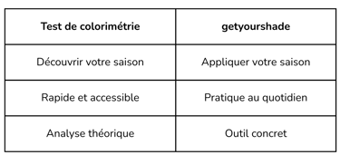 👉 getyourshade ne remplace pas un test en colorimétrie basique : il le complète en aidant à appliquer votre colorimétrie dans la vraie vie.